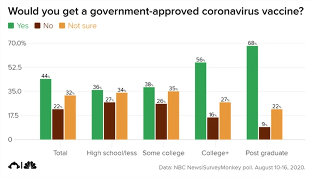 Svět je rozdělený nejen politikou, ale i koronavirem, a tak existuje velká šance, že polovina planety očkování odmítne. Jak ukazuje tento graf, ve Spojených státech by si dnes bez velkého přemýšlení nechalo případnou schválenou vakcínu do těla vpravit jen 44 % lidí.