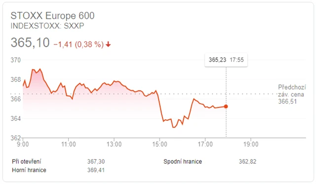 Panevropský index STOXX Europe 600 klesl o 0,35 % na 365,23 bodu, britský FTSE 100 se snížil o 1,7 % na 5 862,05 bodu a francouzský CAC 40 odepsal 0,18 % na 4 938,10 bodu, zatímco německý DAX se zvýšil o 0,22 % na 12 974,25 bodu.