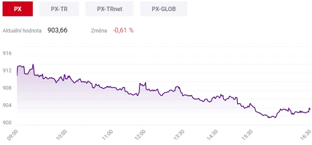 Pražská burza v úterý oslabila, index PX klesl o 0,61 % na 903,66 bodu. Dolů burzu táhl zejména pokles cen akcií Monety a Erste.