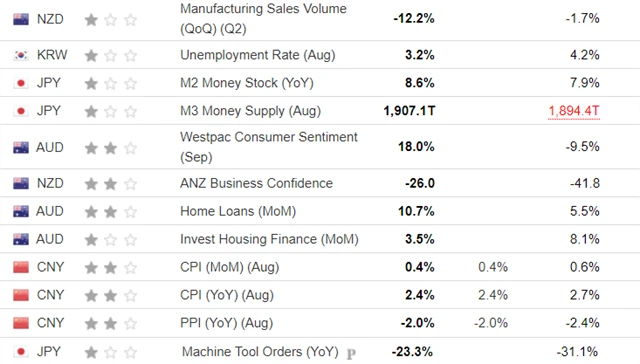 Spotřebitelská inflace v Číně v srpnu podle očekávání zpomalila na 2,4 % meziročně, výrobní ceny pak rovněž podle předpokladů analytiků klesly o 2 %. Příjemně překvapila důvěra spotřebitelů v Austrálii, jejíž index v září stoupl nejvýše za sedm měsíců. Míra nezaměstnanosti v Jižní Koreji pak v srpnu klesla na 3,2 % z červencových 4,2 %. Pokračuje naopak propad v objednávkách výrobních strojů v Japonsku.