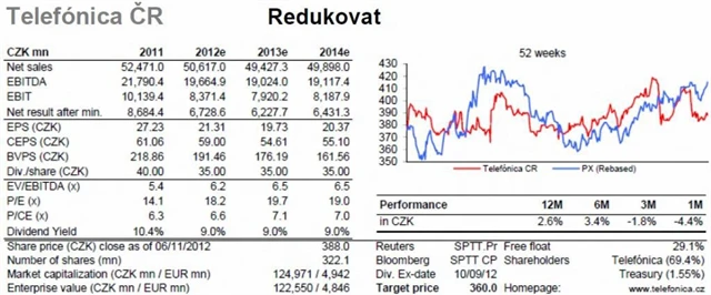 Erste Group upravuje doporučení na akcie Telefóniky Czech Republic z "držet" na "redukovat" a snižuje roční cílovou cenu z 390 Kč na 360 Kč.
