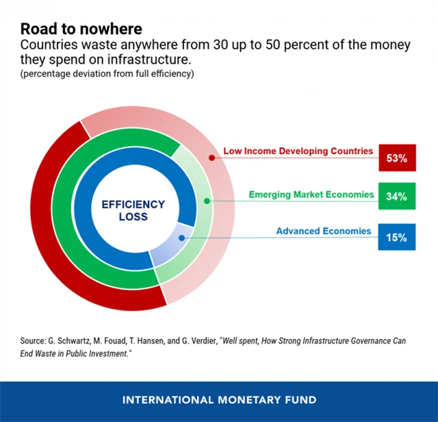 Mimochodem, na téma veřejných investic vydal Mezinárodní měnový fond studii. Ta ukazuje, že třetina peněz investovaných do veřejné infrastruktury vyletí komínem kvůli neefektivitám, korupci, špatnému vyhodnocení nákladů, byrokracii a tak dále. A to především v případě dlouhodobých, velkých a komplexních problémů.
