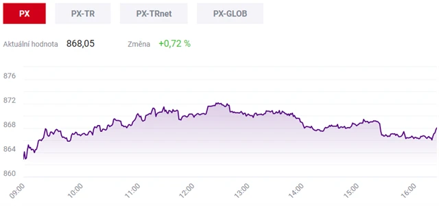 Pražská burza po předchozích pěti dnech poklesů posílila. Index PX zpevnil o 0,72 % na 868,05 bodu. Vzhůru mu pomohly především bankovní tituly.