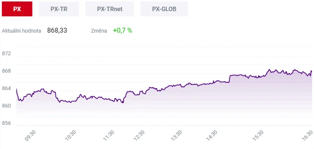 Pražská burza ve středu posílila. Index PX stoupl o 0,70 procenta na 868,33 bodu. Nahoru burze pomohl zejména výrazný růst akcií Moneta Money Bank.