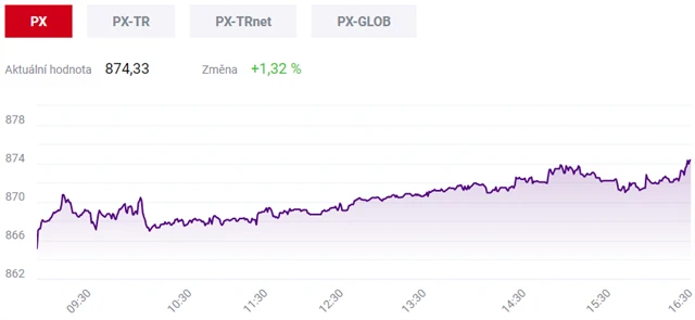 Pražská burza v úterý posílila nejvýrazněji od 11. srpna. Index PX stoupl o 1,32 procenta na 874,33 bodu. Dařilo se převážné většině hlavních titulů v čele s bankami.