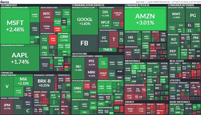 Index Dow v pátek stoupl o 0,57 % na 28 586,90 bodu, širší S&P 500 přidal 0,88 % na 3 477,14 bodu a index technologického trhu Nasdaq Composite se zvýšil o 1,39 % na 11 579,94 bodu. Index volatility VIX klesl o 5,16 % na 25 bodů a výnos 10letých vládních dluhopisů USA se zvýšil o jeden a půl bazického bodu na 0,779 %.