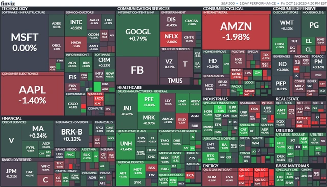 Index Dow si v pátek připsal 0,39 % a uzavřel na 28 606,31 bodu a širší index S&P 500 vzrostl o 0,01 % na 3 483,81 bodu, index technologického trhu Nasdaq Composite se však snížil o 0,36 % na 11 671,56 bodu. Index volatility VIX stoupl o 1,63 % na 27,41 bodu a výnos 10letých vládních dluhopisů USA se zvýšil o jeden a půl bazického bodu na 0,747 %.
