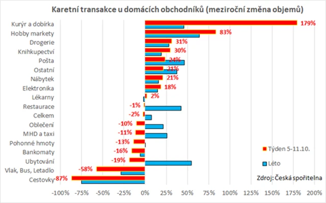- Dobrou zprávou je, že lidé začínají nakupovat více on-line a nechávají si věci dovézt domů. Platby kurýrům vzrostly o 180 % (v létě +46 %). S tím jde ruku v ruce i urychlení poklesu výběrů z bankomatů (-16 % meziročně). Takové chování omezuje propad celkové spotřeby.