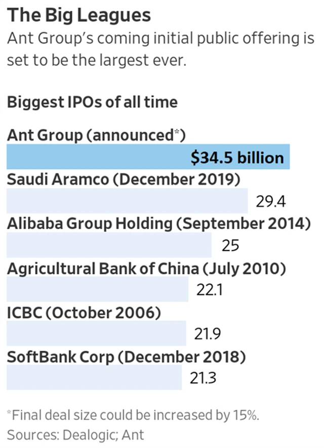 Společnost Ant Group, která je finančně-technologickou divizí čínského internetového prodejce Alibaba a dominantním provozovatelem mobilních plateb v Číně, získá z primárního veřejného úpisu svých akcií 34,5 miliardy USD. IPO podniku Ant Group se stalo historicky největším a společnost ocenilo na 313,37 miliardy USD.