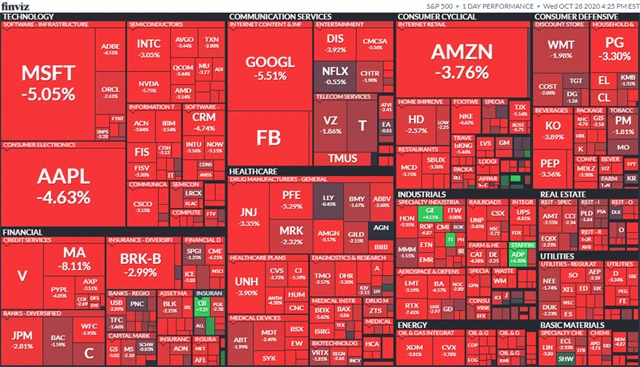 Americké akcie se ve středu propadly, hlavní indexy odepsaly kolem tří a půl procenta a Dow klesl na hodnoty z konce července. Na vině byly obavy investorů kvůli šíření nákazy covidem-19 ve světě a blížícím se volbám ve Spojených státech.