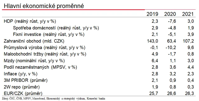 Opětovné uzavření ekonomiky si vynutilo revizi odhadu vývoje hospodářství níže. Komerční banka předpokládá, že tuzemská ekonomika letos poklesne v reálném vyjádření o 7,6 %. Určitá míra opatření mířících proti šíření nemoci, ale zároveň negativně ovlivňující ekonomiku s námi bude zřejmě až do poloviny příštího roku. Oživení v první polovině roku nebude tak výrazné, jak jsme původně předpokládali. Celoroční hospodářský růst v roce 2021 tak banka nově vyhlíží na úrovni 3 %.