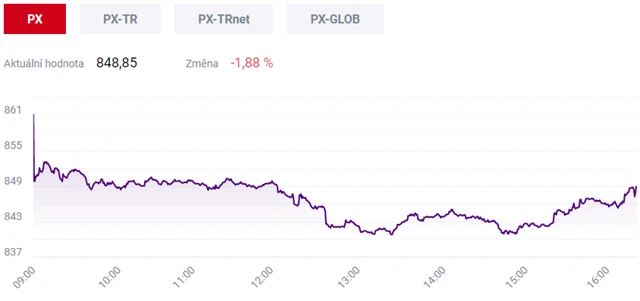 Index PX pražské burzy ve čtvrtek oslabil o 1,88 % na 848,85 bodu. Byl to nejvýraznější pokles od konce července. Nedařilo se téměř všem hlavním titulům v čele s bankovními emisemi.