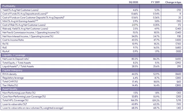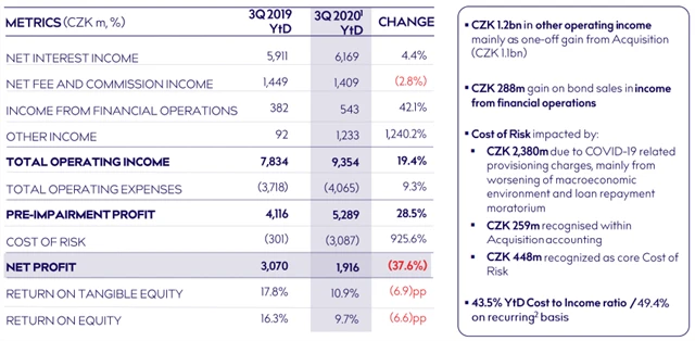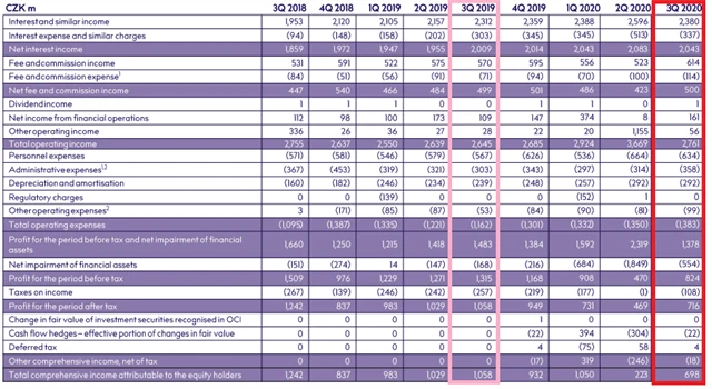 Čistá úroková marže banky dosáhla v třetím čtvrtletí 2,9 % oproti 3,8 % za loňský rok. Banka má nadále silnou kapitálovou pozici, poměr Tier 1 dosahoval na konci čtvrtletí 14,4 %, na konci roku 2019 byl na úrovni 16,4 %. Poměr úvěrů ke vkladům dosahoval na konci čtvrtletí 80,2 %, na konci roku 2019 byl 86,2 %.