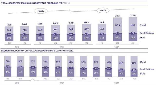 Bilance retailových úvěrů se i díky akvizici aktiv Wüstenrotu ke konci třetího čtvrtletí meziročně zvýšila o 68,1 % na 145,8 miliardy Kč, v segmentu hypotečních úvěrů došlo ke zvýšení bilance o 122,3 % na 90,4 miliardy Kč. Bilance úvěrů poskytnutých firmám se meziročně zvýšila o 17,2 % na 77 miliard Kč, z toho objem úvěrů pro malé podniky se zvýšil o 21,5 % na 7,8 miliardy Kč.