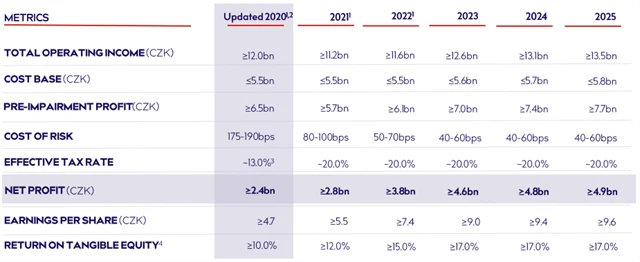 V roce 2021 by měly provozní výnosy banky činit minimálně 11,2 miliardy Kč a čistý zisk by měl být nejméně 2,8 miliardy Kč. Poté čeká MONETA výrazný růst čistého zisku, v roce 2022 na minimálně 3,8 miliardy Kč a do roku 2025 poté na minimálně 4,9 miliardy Kč.