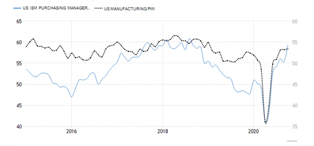 V případě ukazatele ISM se dílčí index zaměstnanosti zvýšil na 53,2 bodu z 49,6 bodu a index nových objednávek vyskočil na 67,9 bodu z 60,2 bodu. Úroveň 50 bodů je předělem mezi růstem aktivity a jejím poklesem.
