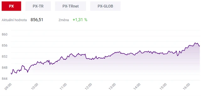 Pražská burza v úterý navázala na pondělní růst a index PX stoupl o 1,31 % na 856,51 bodu. Vzhůru ji tlačil optimismus na akciových trzích ve světě. Z hlavních emisí ztrácely jen akcie České zbrojovky.