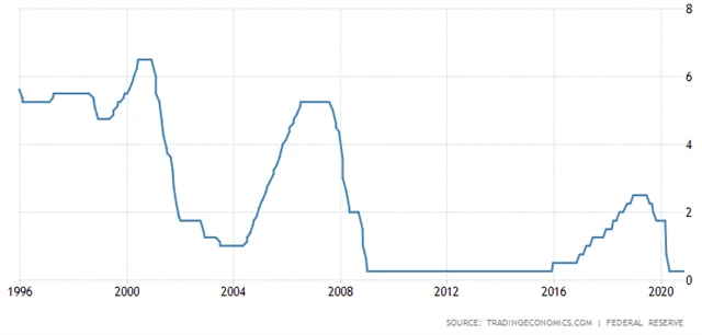 Fed letos svou základní úrokovou sazbu dvakrát snížil. První snížení přišlo v souvislosti s koronavirem 3. března (z 1,50-1,75 % na 1,00-1,25 %), druhé pak 15. března (z 1,00-1,25 % na 0,0-0,25 %). S uvolňováním měnové politiky však banka začala již loni ve snaze ochránit ekonomiku před negativními důsledky oslabování globálního hospodářského růstu a obchodní války mezi Washingtonem a Pekingem. Před příchodem koronaviru nicméně předpokládala, že letos budou sazby stagnovat.