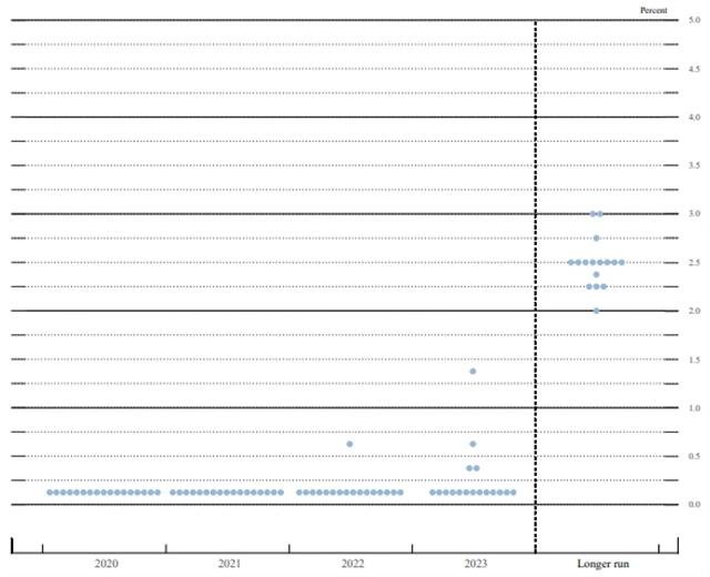 Fed - výhled vývoje sazeb (tzv. dot plot, září 2020)