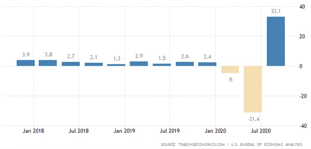 Ekonomika Spojených států ve třetím čtvrtletí podle prvního odhadu vykázala rekordní vzestup. Přispěla k němu vládní pomoc v objemu více než tří bilionů dolarů. Ta podpořila zejména výdaje spotřebitelů. Hrubý domácí produkt USA se v přepočtu na celý rok zvýšil o 33,1 %. Tempo růstu HDP bylo v uplynulém čtvrtletí nejvyšší minimálně od roku 1947, kdy vláda začala tyto údaje sledovat. Ve druhém čtvrtletí ekonomika USA naopak kvůli koronaviru klesla rekordním tempem 31,4 %.