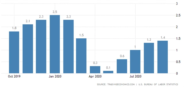 Spotřebitelské ceny ve Spojených státech se v září meziročně zvýšily o 1,4 %. Jejich růst tak zrychlil z 1,3 % v srpnu a dosáhl nejvyšší úrovně za půl roku. V meziměsíčním srovnání pak ceny vzrostly o 0,2 %. Meziměsíční růst spotřebitelské ceny zaznamenaly už počtvrté v řadě, v období od března do května se snižovaly.