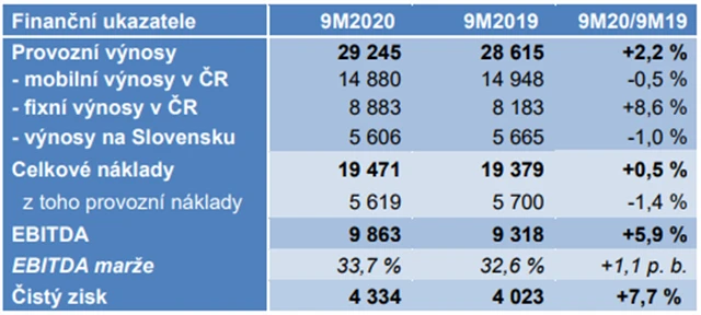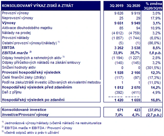 Za samotné třetí čtvrtletí firma vykázala celkové výnosy 9,95 miliardy Kč (meziročně +3,1 %), provozní zisk EBITDA 3,54 miliardy Kč (meziročně +8,5 %) a čistý zisk 1,66 miliardy Kč (meziročně +16,8 %). EBITDA marže se meziročně zvýšila ve třetím čtvrtletí na 35,7 % z 33,9 %.