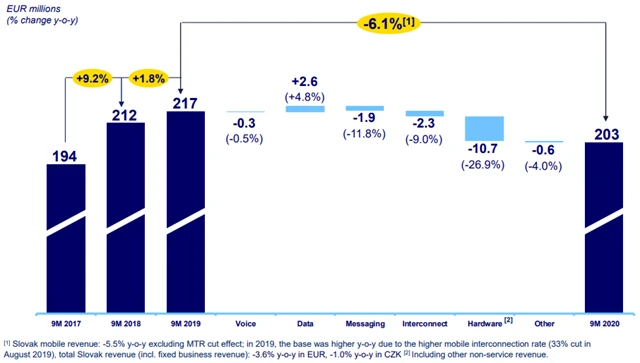 Na Slovensku klesly celkové provozní výnosy meziročně o procento na 5,61 miliardy Kč. Podobně jako v České republice stály za poklesem především nižší výnosy z roamingu a prodeje telefonů. Počet zákazníků se na Slovensku zvýšil o 73 000 na 2,189 milionu.