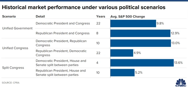 "Nejlépe se indexu S&P 500 dařilo právě s rozděleným Kongresem a demokratickým prezidentem. Nemá však smysl dělat závěry z čísel, která neříkají nic o budoucnosti a neberou v potaz ani inflaci. Pro dlouhodobé investory se s tím, kdo sedí v Kongresu a Bílém domě, nic moc nemění," poznamenal Martin Luňáček z investiční robo advisory platformy Portu.