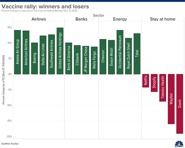Výrazný přesun peněz do akcií firem, jež jsou pandemií koronaviru tvrdě zasaženy (United Airlines +19,15 %, Carnival +39,29 %), vyvolal odliv zájmu investorů o akcie velkých technologických firem, jež naopak z prostředí pandemie dokázaly těžit (Microsoft -2,38 %, Facebook -4,99 %, Amazon -5,06 %, Zoom -17,37 %, Netflix -8,59 %).
