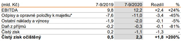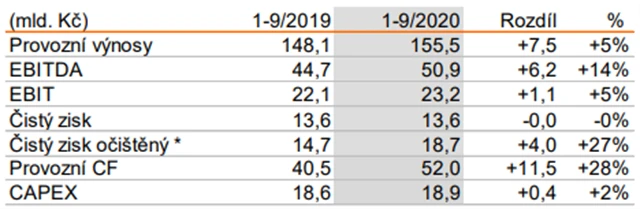 Za samotné třetí čtvrtletí ČEZ vykázal výnosy 49,3 miliardy Kč (3Q2019: 48 miliard Kč) a provozní zisk EBITDA 12,2 miliardy Kč (3Q2019: 9,8 miliardy Kč). Na úrovni čistého zisku skupina reportovala záporný výsledek 1,1 miliardy Kč. Čistý zisk po očištění o mimořádné vlivy však dosáhl 2,3 miliardy Kč. Na úrovni čistého zisku výsledek zatížily opravné položky a odpisy majetku v Polsku (-1,4 miliardy Kč), Rumunsku (-0,8 miliardy Kč), Severočeských dolech (-0,7 miliardy Kč), Bulharsku (-0,2 miliardy Kč) a elektrárně Dětmarovice (-0,2 miliardy Kč).