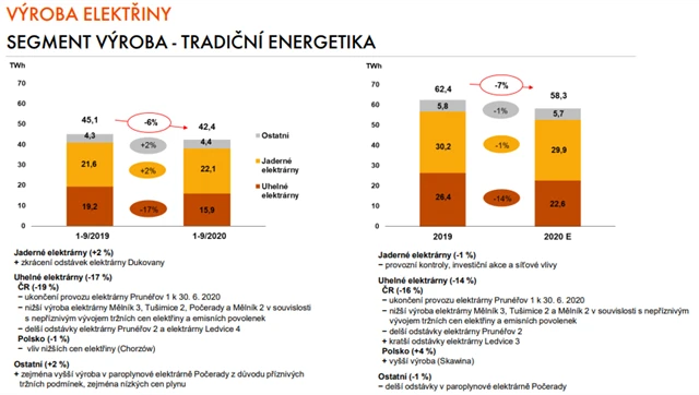 Výroba elektřiny z tradičních zdrojů meziročně klesla o 6 %, zejména v důsledku růstu cen emisních povolenek, poklesu cen elektřiny vlivem covidu-19 a s ohledem na načasování odstávek výrobních zdrojů. Ke snížení výroby přispívá také útlum dosluhujících uhelných elektráren, především uzavření elektrárny Prunéřov 1. Výrazně poklesla také těžba uhlí - meziročně o 28 % na 10,7 milionu tun.
