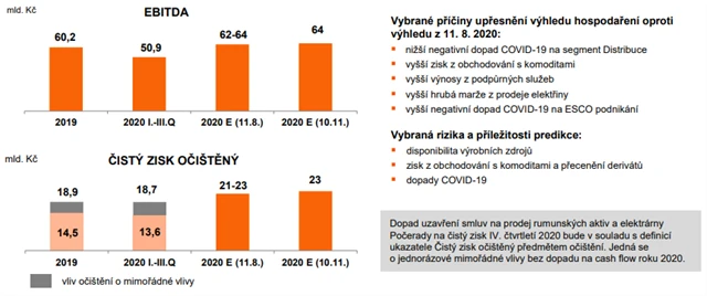 "Celoroční EBITDA i očekávaný čistý zisk očištěný o mimořádné vlivy potvrzujeme na horní hranici dosud udávaného rozpětí. EBITDA na úrovni 64 miliard Kč a očištěný čistý zisk na úrovni 23 miliard Kč. Čistý zisk ve čtvrtém čtvrtletí bude zatížen opravnými položkami v souvislosti s prodejem rumunských aktiv, ty ovšem nejsou peněžním výdajem, ale důsledkem historického vývoje kurzu RON/CZK a negativních regulatorních zásahů v Rumunsku v minulosti, zejména do regulace obnovitelných zdrojů energie," uvedl finanční ředitel skupiny Martin Novák.