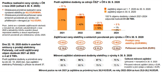 Společnost standardně pokračuje v zajišťování tržeb z výroby elektřiny ve střednědobém horizontu. Na rok 2021 měl ČEZ v září předprodáno asi 77 % očekávané výroby za 45,80 EUR/MWh, na rok 2022 asi 50 % výroby za 47,10 EUR/MWh, na rok 2023 asi 21 % za 47,40 EUR/MWh a na rok 2024 asi 3 % za 48,50 EUR/MWh.