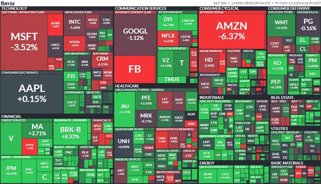 Za celý uplynulý týden Dow zpevnil o 4,08 % a S&P 500 přidal 2,16 %, Nasdaq Composite ale oslabil o 0,55 %.