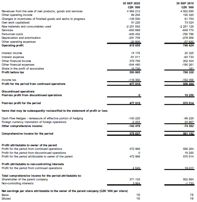 Provozní zisk za první tři čtvrtletí roku dosáhl 815,7 milionu korun, a meziročně tak byl vyšší stejně jako tržby o 10,2 %. Zisk EBITDA z pokračujících operací ale klesl meziročně o 7,7 % na na 952,4 milionu korun, a to hlavně vlivem toho, že firma do tohoto ukazatele započítává i přecenění závazků kvůli vývoji měnových kurzů. Oslabení koruny vůči euru a dolaru způsobilo ztrátu kvůli přecenění zajišťovacích instrumentů.