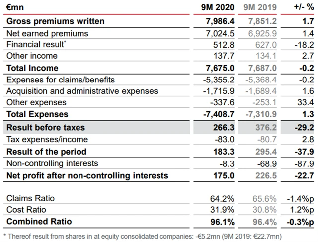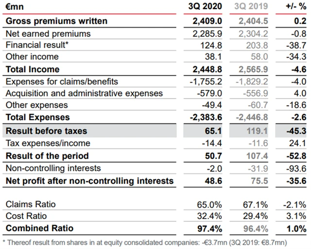 Za samotné třetí čtvrtletí skupina vykázala hrubé předepsané pojistné 2,41 miliardy eur (meziročně +0,2 %), zisk před zdaněním 65,1 milionu eur (meziročně -45,3 %) a čistý zisk 48,6 milionu eur (meziročně -35,6 %). Kombinovaný poměr se meziročně zvýšil o procentní bod na 97,4 %.