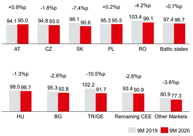 Poměr nákladů a nárokovaných škod proti pojistnému (kombinovaný poměr), což je měřítko ziskovosti, se meziročně snížil o 0,3 procentního bodu na 96,1 %. Čím níže je ukazatel pod 100 %, tím větší je ziskovost pojišťovny. Překročení 100 % znamená ztrátu. Kombinovaný poměr se snížil nejvýrazněji v Turecku/Gruzii (-10,5 procentního bodu na 91,7 %) a na Slovensku (-7,4 procentního bodu na 90,6 %). V Rakousku se zvýšil o 0,9 procentního bodu na 95 %, zatímco v Česku klesl o 1,8 bodu na 93 %.