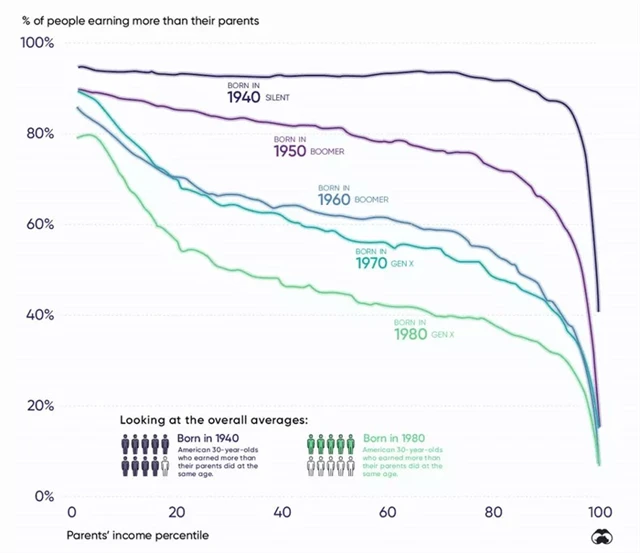 Poválečný boom nastartoval ve Spojených státech, ale i jinde ve světě trend, díky kterému platilo, že se nová generace bude mít v životě takřka jistě lépe než ta předchozí. U lidí narozených v roce 1940 tomu tak v Americe bylo v devíti případech z deseti. V případě současných čtyřicátníků je ale šance na mezigeneračně lepší život již jen 50%. Trend křivek přitom naznačuje, že čísla mohou dále klesat.