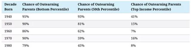 Vždy platilo, že šanci na mezigeneračně finančně lepší život mají hlavně ti, jejichž rodiče mají nízké příjmy. Jinými slovy, čím chudší rodiče, tím větší šance, že jejich děti na tom budou lépe. Znepokojující ovšem je, že zatímco u lidí narozených v roce 1940 s rodiči v pátém příjmovém decilu byla šance na finančně bohatší život více než 90%, u lidí narozených v roce 1980 již není ani 50%, přičemž prudce padá i s jen mírným růstem příjmů rodičů.