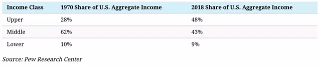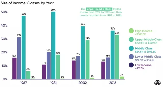 Důležité je ale také vnímat vývoj distribuce příjmů napříč společností. Zatímco v roce 1970 patřilo do skupiny s vyššími příjmy 28 % lidí a do skupiny s průměrnými příjmy 62 %, v roce 2018 již bylo ve skupině s vyššími příjmy 48 % lidí. Podíl lidí s nejnižšími příjmy přitom zůstává víceméně stabilní.
