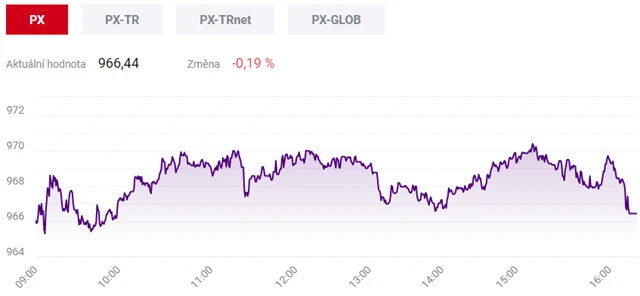 Pražská burza znovu neudržela nejsilnější úroveň od březnového začátku šíření nemoci covid-19 v Česku. Index PX v pondělí ztratil 0,19 % na 966,44 bodu. Klesly akcie Monety Money Bank, Erste Group Bank a energetické firmy ČEZ.