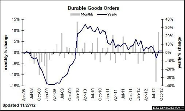 Příjemně překvapily objednávky zboží dlouhodobé spotřeby za říjen. Ty (očištěné o vliv nákupů aut) v říjnu vzrostly o 1,5 %, když se čekal naopak pokles o 0,4 %. I s auty byl výsledek lepší, než se čekalo, mírně nepříznivá ovšem byla revize zářijových údajů.