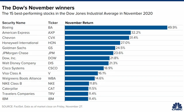 V pondělí akcie uzavřely listopad, který byl z pohledu jejich výkonnosti mimořádný. Benchmarky Dow a Nasdaq Composite během něj přidaly téměř 12 % a S&P 500 bezmála 11 %.