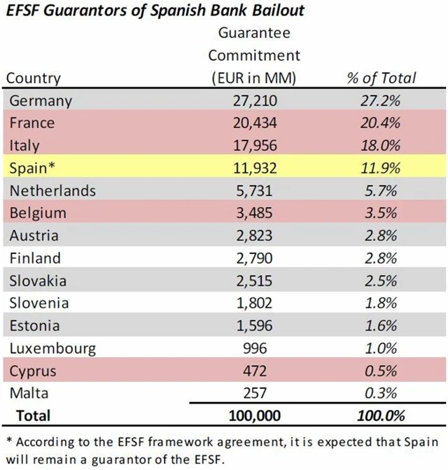 Těm, kdo jsou zběhlí ve fungování záchranných evropských fondů, následující tabulka dech nevyrazí. Těm ostatním může Španělsko jako garant půjčky na záchranu španělských bank připadat jako pěst na oko. Mimochodem, například Itálie by hospodařila s vyrovnaným rozpočtem, nebýt jejích povinných plateb do společných záchranných fondů.