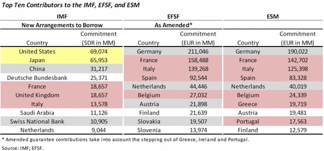 Záchranné operace se aktuálně týkají samozřejmě především Řecka. Jak ukazuje další druhá tabulka, Řecko patří vzhledem k velikosti ekonomiky mezi deset největších přispěvatelů do fondu ESM. Řada dalších zemí, například Francie, Itálie nebo Španělsko, odvádějí desítky miliard eur do záchranných fondů a do MMF. Dvě nejvíce přispívající země světovém měřítku - Spojené státy a Japonsko - jsou zároveň jedny z nejvíce zadlužených. Světová ekonomiko, gratulujeme.