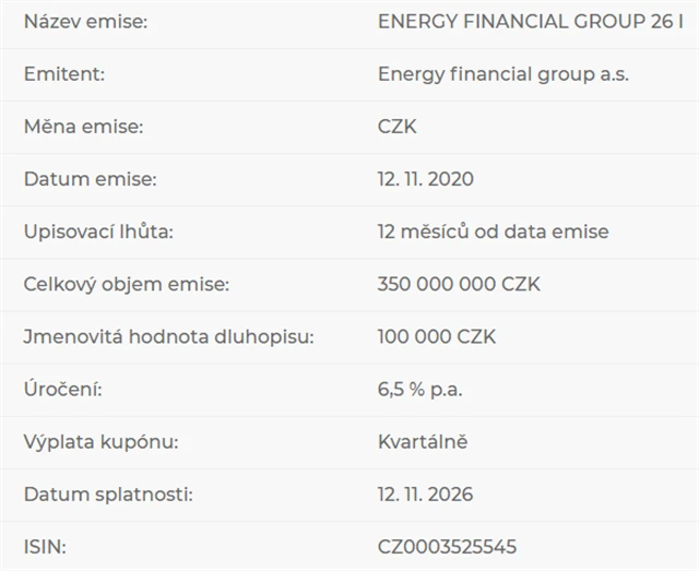 Investiční skupina EFG vydala letos v listopadu vůbec poprvé veřejně dostupnou sérii dluhopisů o celkovém objemu 350 milionů Kč. Nominální hodnota je 100 tisíc Kč za kus, dluhopisy jsou úročeny pevnou úrokovou mírou 6,5 % ročně a splatné v roce 2026. Výnos se vyplácí čtvrtletně zpětně.