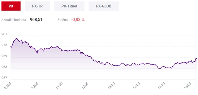 Pražská burza v pátek pokračovala v oslabování, klesla o 0,8 %