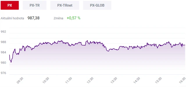 Pražská burza v úterý opět rostla, index PX posílil o 0,57 procenta na 987,38 bodu. Znovu ho táhnul především finanční sektor. Řada titulů ale zakončila den v červeném, více než procento odepsaly například akcie elektrárenské společnosti ČEZ nebo likérky Stock.
