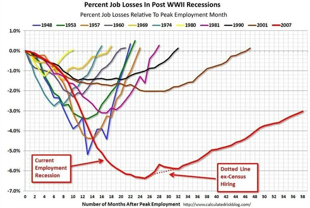 Celková míra nezaměstnanosti v USA v listopadu nečekaně klesla na 7,7 %, překvapivě vysoký počet nových pracovních míst byl ale vyvážen negativními revizemi údajů z předchozích měsíců. Vývoj zaměstnanosti dlouhodobě sleduje Doug Short ve svém grafu, který srovnává návrat zaměstnanosti na úroveň před recesí. Ameriku čeká ještě hodně práce.