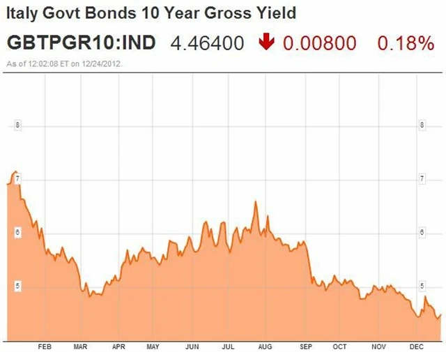 Italské i španělské dluhopisy od té doby stabilně posilují a obě velké země eurozóny se tak podařilo (alespoň prozatím) udržet mimo záchranné evropské mechanismy (EFSF a ESM), nemusely požádat o pomoc. Ekonomická situace v nich je sice stále neuspokojivá (vysoká nezaměstnanost, recese), navíc v Itálii již není premiérem trhy velice oblíbený technokrat Mario Monti, záruka odkupovat dluhopisy v rámci programu OMT ze strany ECB je ale pro investory do dluhopisů zásadní.